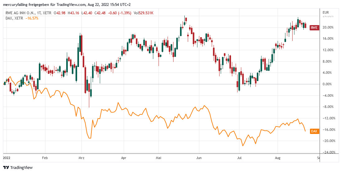 Die Aktie von RWE konnte sich in den vergangenen Wochen dem Abwärtstrend am Gesamtmarkt weitgehend entziehen, wie ein vergleichender Blick seit Jahresbeginn mit dem DAX in Chart 1 zeigt.