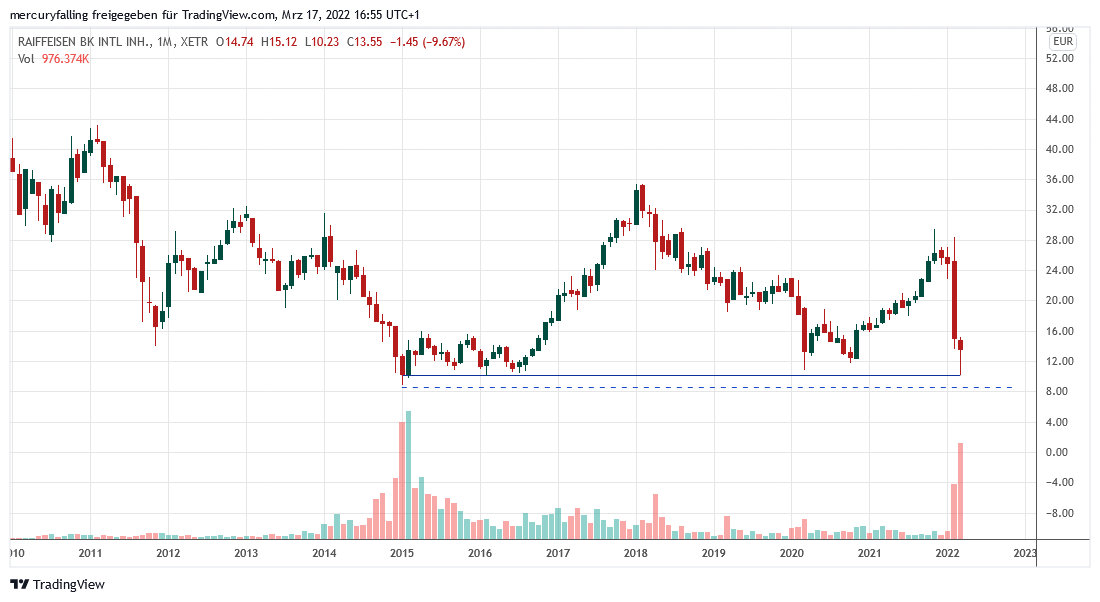 Die Aktie von Raiffeisen International hat derzeit bereits einen bedeutenden Teil dieser Krisenkosten eingepreist. Im Zuge des Absturzes von rund 26 Euro fiel der Titel bei sehr hohem Umsätzen bis an seine Unterstützung oberhalb von 10 Euro.