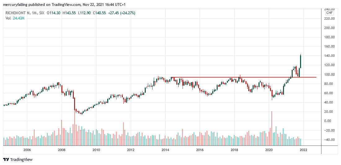 Ein Blick auf die langfristige Entwicklung der Aktie zeigt, dass damit die Konsolidierung des Ausbruchs aus der seit August 2013 laufenden Seitwärtsbewegung beendet wurde, im Zuge dessen das Ausbruchsniveau bei knapp 95 CHF nochmals getestet wurde. Diese Konsolidierung wurde schließlich mit dem Ausbruch am 08.11.2021 über das Zwischenhoch vom 04.08.2021 bei 119 Franken beendet.