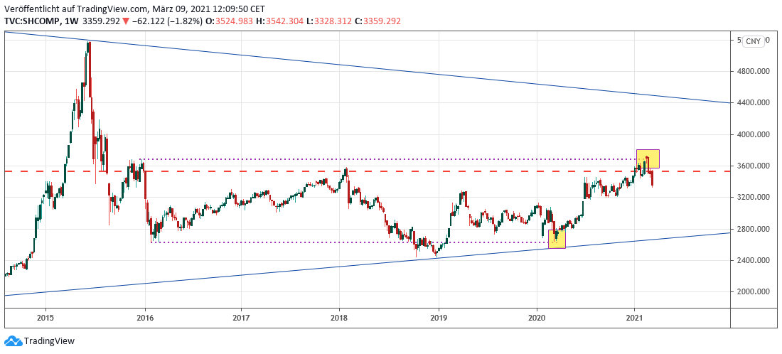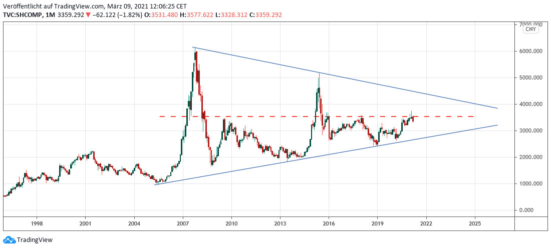 Aus langfristiger Perspektive hat sich nun seit dem Ausbruch 2006/2007 ein ausgedehnter Konsolidierungskeil gebildet, bei dem die Winkel beider Schenkel eine hohe Symmetrie aufweisen. Aktuell befindet sich der Index in der Nähe der Symmetrielinie und damit noch relativ weit entfernt von einem großen Impulssignal in die eine oder andere Richtung.