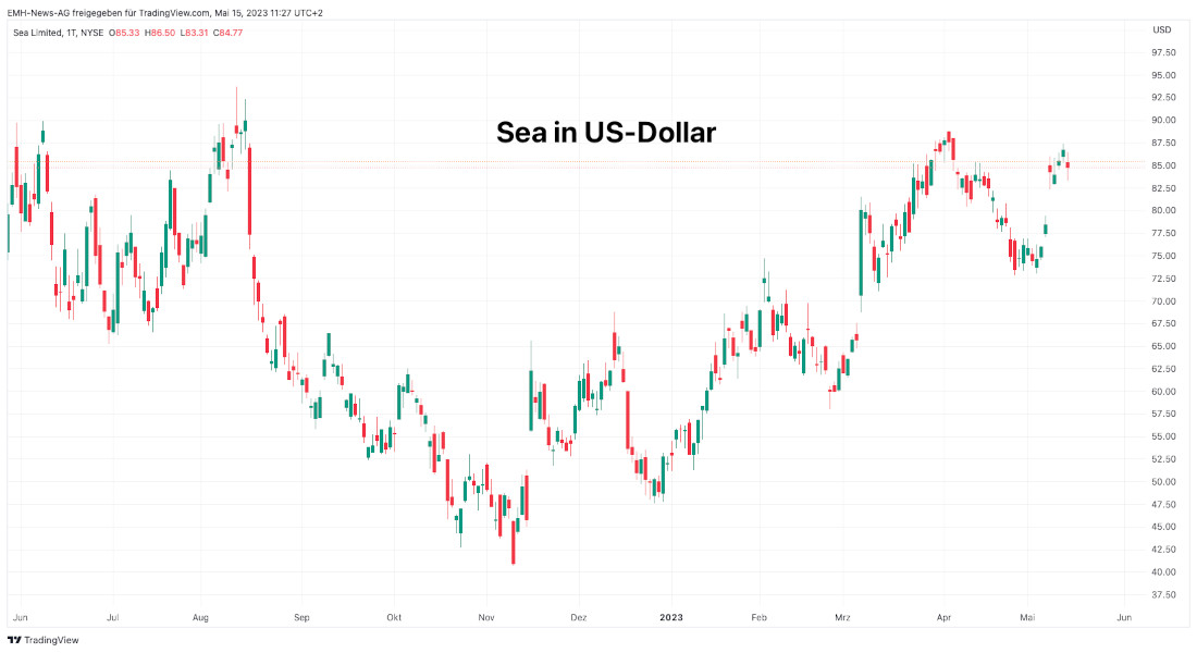 Das Umsatzwachstum wird im ganzen Jahr bescheiden bleiben. Die Wall Street rechnet nur mit einem kleinen Anstieg um 7 % auf 13,4 Mrd. US-Dollar. Erst für 2024 sieht man wieder zweistellige Wachstumsraten beim Umsatz. Der Fortschritt wird im Wesentlichen aufseiten des Ergebnisses gesehen, das „bereinigt“ von -2,96 US-Dollar auf +1,72 US-Dollar je Aktie in 2023 steigen und dann weiter auf 2,23 US-Dollar in 2024 wachsen soll. Sea zeigt damit, dass das unterliegende Geschäft sehr profitabel ist. Damit unterscheidet man sich von vielen Konkurrenten in Asien.