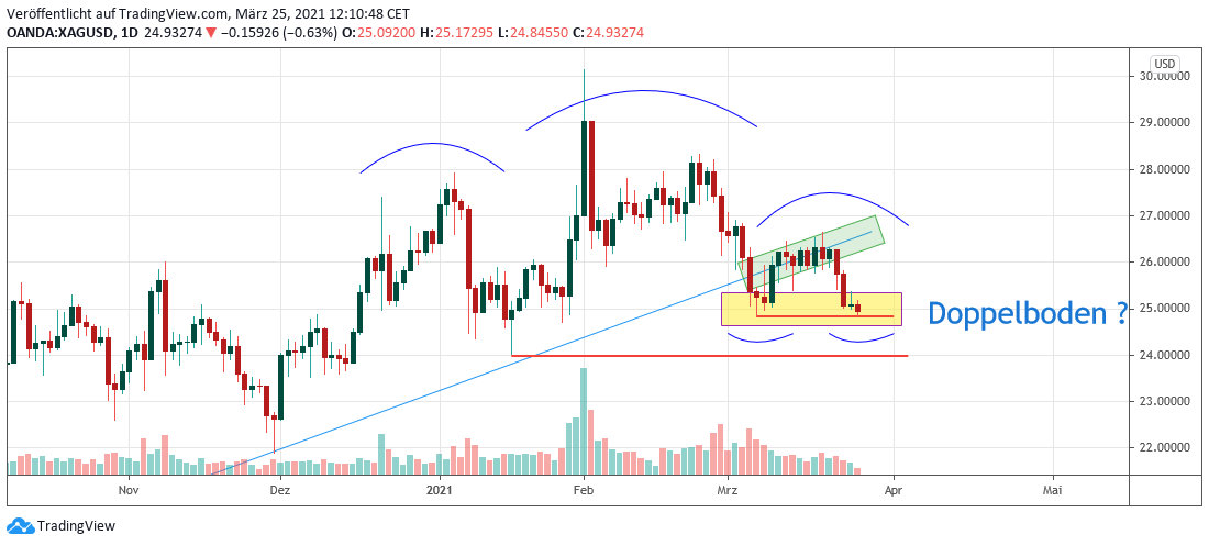 Diese Bewegung würde sich wohl beschleunigen, wenn das Tief des kleinen Doppelbodens, welches am 05.03.2021 erreicht wurde und das bei 24,83 Dollar liegt, unterschritten wird. Damit wäre die erste Hypothese mehr oder weniger entwertet, insbesondere dann, wenn die Umsätze in dieser Phase zunehmen.