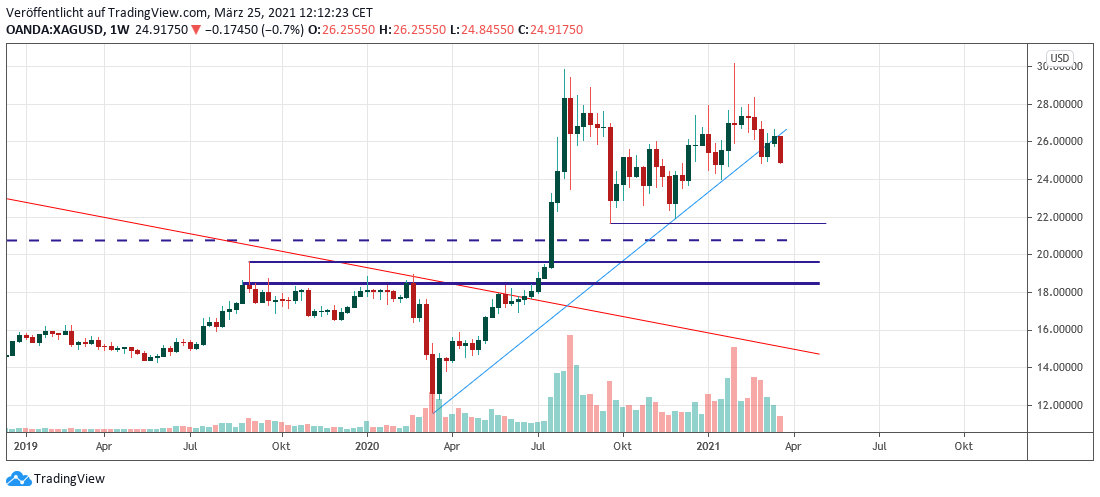 Dagegen stehen zum anderen steigende langfristige Zinsen in den USA, was das Sentiment des gesamten Edelmetallsektors belastet. Dazu gesellt sich eine gewisse Verschiebung innerhalb derjenigen Investoren, welche bislang auf Edelmetalle setzten, nun aber von der ,,Sexiness‘‘ der Kryptowährungen übermannt werden und einen mehr oder weniger großen Anteil ihrer Anlagen umschichten. Und dies vor dem Hintergrund, dass Silber seit August 2020 eine Konsolidierung seines vorherigen explosiven ,,Slingshot Moves‘‘ durchmacht. In diesem Prozess sucht der Silberpreis nun einen Boden, hat diesen aber aktuell noch nicht in eine Form gegossen, die aus charttechnischer Sicht überzeugend ist.