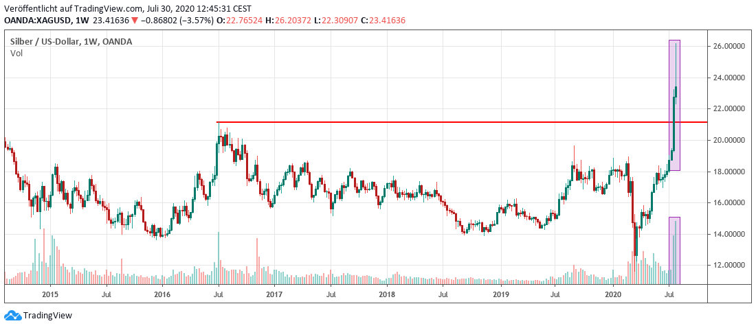 Die gleichgerichtete Impulsrichtung von Umsätzen und Preisen bestätigt die große Bedeutung der Marke von 21,13 Dollar und gleichzeitig auch jene der fraktalen Struktur von Silber generell.