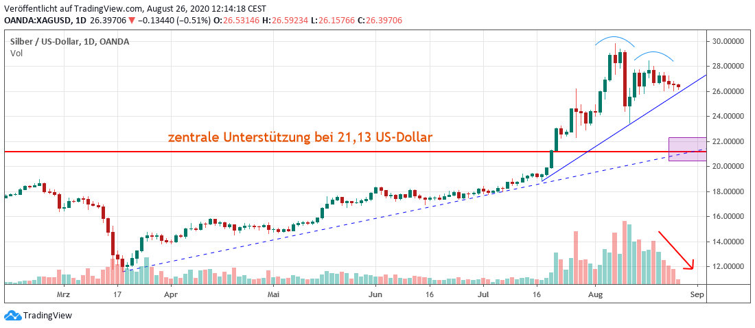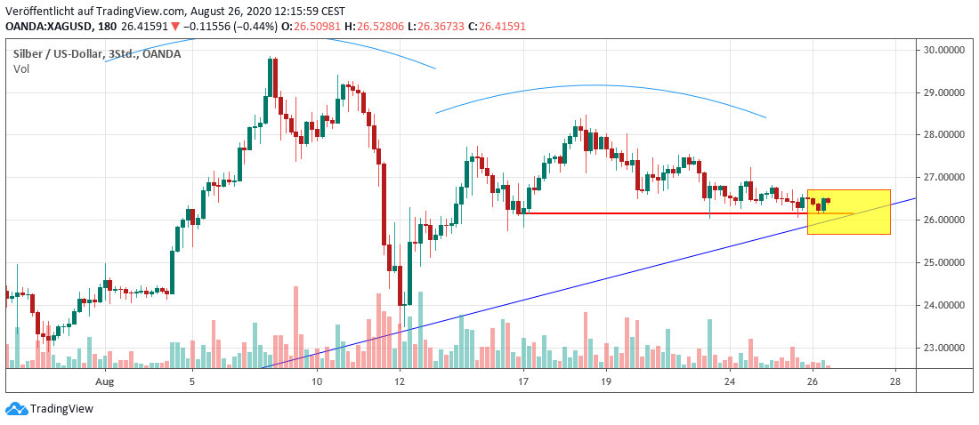 Ein Unterschreiten der Marke von 26,15 Dollar ist für die kurzfristige Entwicklung des Silberpreises kritisch. Dies macht einen Test der Marke von 23,45 Dollar wahrscheinlich. Mittel- und langfristige Effekte löst aber erst ein Unterschreiten der Marke von 21,13 Dollar auf Monatscandle-Basis aus. Alles andere sind charttechnische Phantomschmerzen.