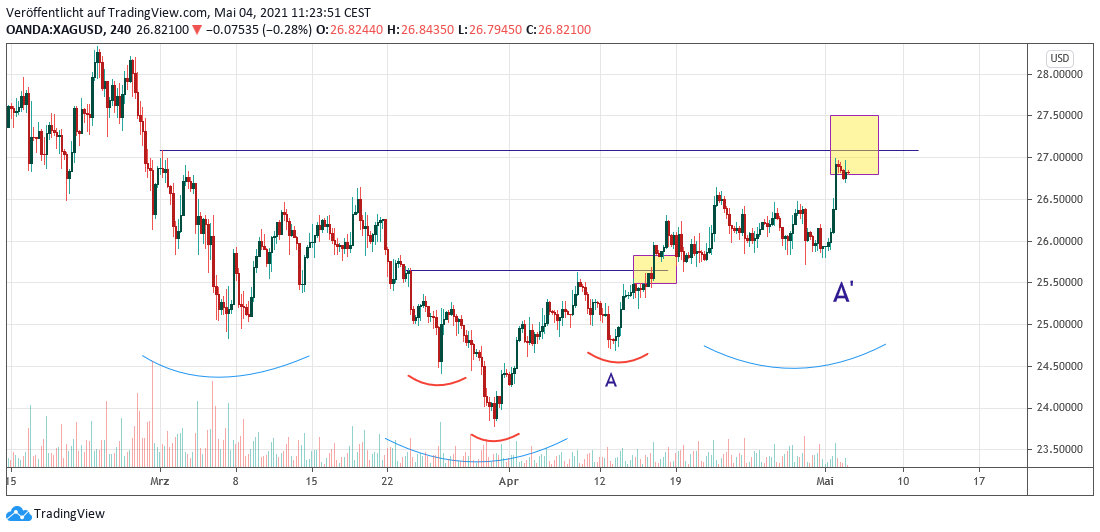 In Chart 1 ist der Silberpreis auf Stundenbasis dargestellt. Darin markiert sind eine vermutete, bereits mehrfach erwähnte Bodenbildungsstruktur in Form einer umgekehrten S-K-S-Formation, dargestellt durch hellblaue Untertassen. Die obere blaue Horizontale ist nicht die Nackenlinie dieser Umkehrformation, sondern ihre Signifikanzlinie. Die Nackenlinie der größeren S-K-S-Formation wurde am 18.03.2021 und liegt bei 26,64. Diese wurde zuvor bereits am 21.04.2021 kurz überschritten, jedoch nicht signifikant.