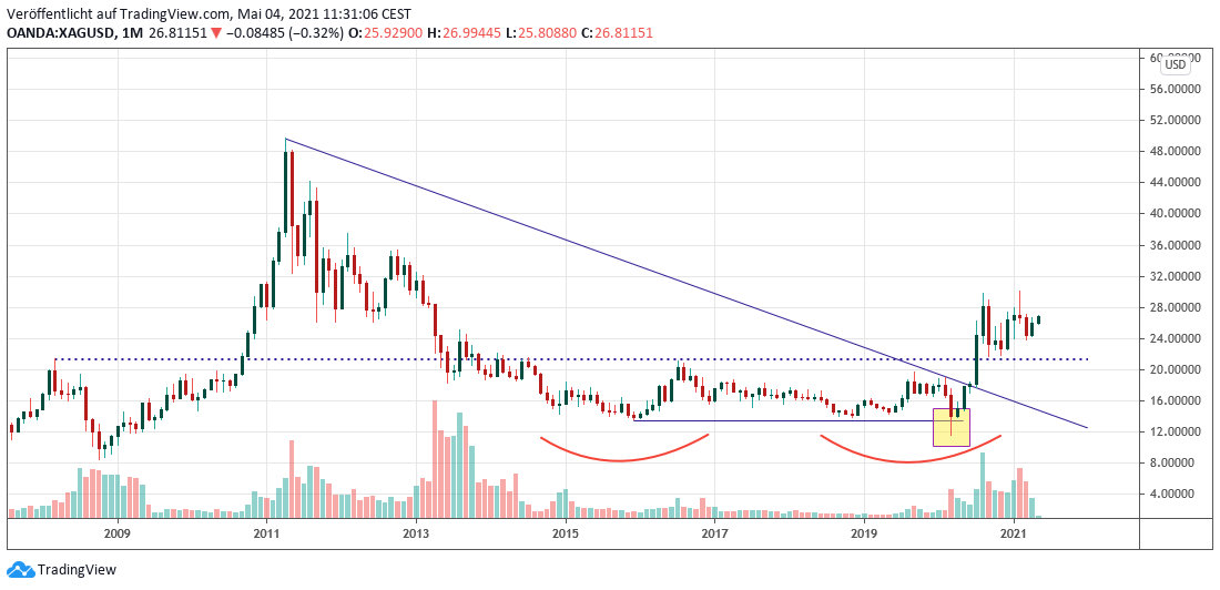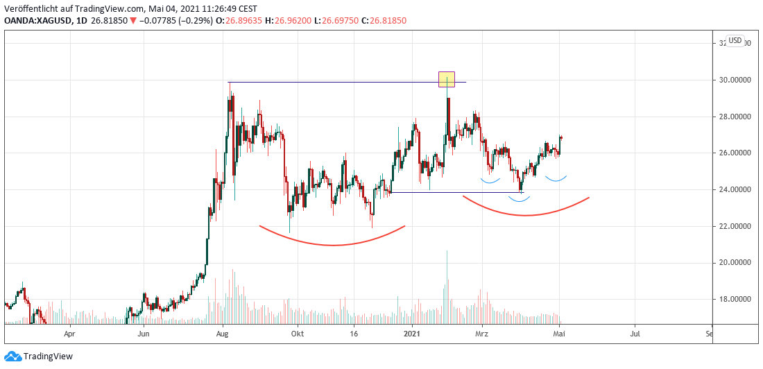 Geht man eine weitere Skale nach oben und fügt diese Ergebnisse in einen Chart auf Tagesbasis ein, so lässt sich mustertechnisch vermuten, dass die seit dem Reddit-Crow-Angriff auf den Silberpreis am 01.02.2021, bei dem das Zwischenhoch des Ausbruchs vom Sommer 2020 bereits überschritten wurde und welches mit einem gelben Rechteck markiert ist, ein Doppelboden vorliegt. Dieser ist in Chart 2 mit roten Untertassen markiert.