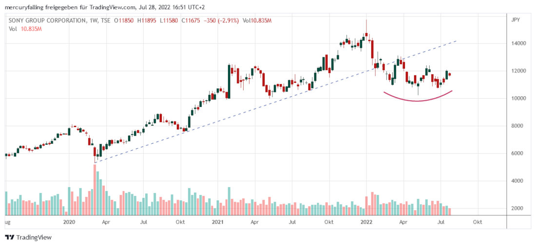 Im Zuge der Bodenbildung hat der Titel eine umgekehrte S-K-S-Formation ausgebildet, deren Korrekturtief am 10.05.2022 bei 10.220 Yen markiert wurde. An diesem Tag veröffentlichte der Konzern seine Zahlen des Finanzjahres 2021 und seine Prognose für das laufende Finanzjahr in Höhe von 830 Mrd. Yen.