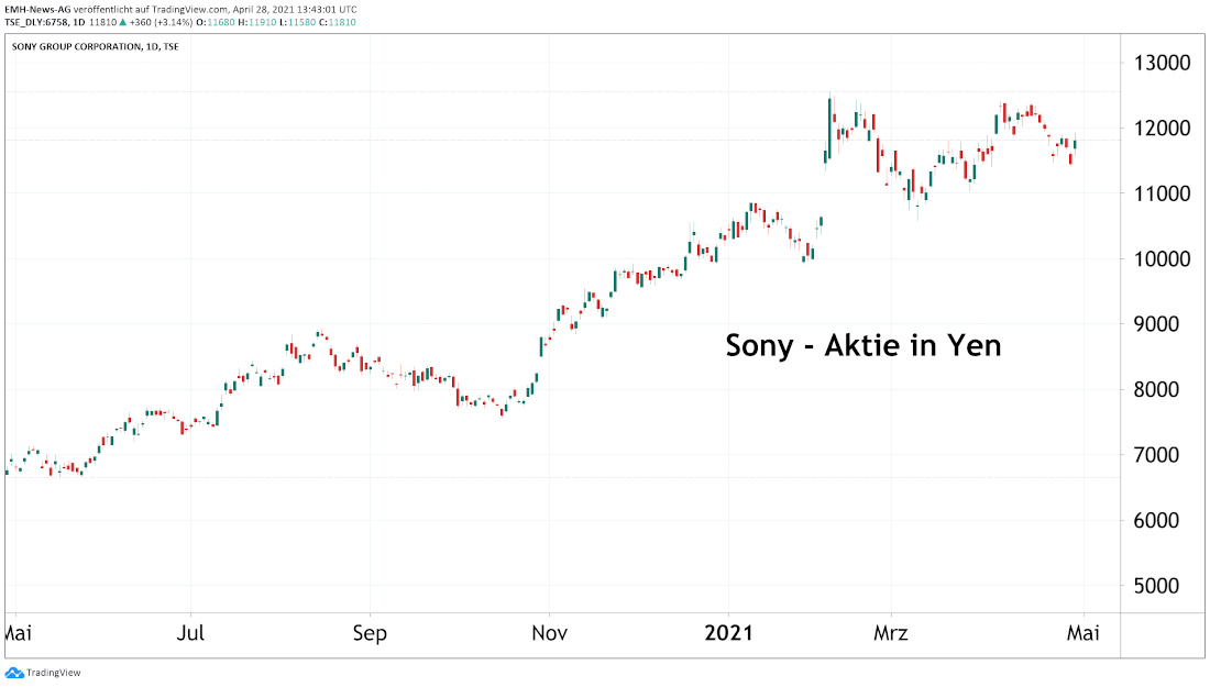Für die laufende Zwölfmonatsperiode rechnet das Sony-Management mit einem weiteren Umsatzanstieg von 8 % auf insgesamt 9.700 Milliarden Yen. Gleichzeitig stellt die Firma einen Nettogewinnrückgang von 44 % auf 660 Milliarden Yen sowie eine Reduktion beim operativen Gewinn um 4 % auf 930 Milliarden Yen in Aussicht. So sind vor dem Hintergrund der Computerchipknappheit, welche zu höheren Preisen bei Bauteilen im Einkauf führen kann, durchaus signifikante Einbussen bei den Umsatzmargen keinesfalls unrealistisch. Entsprechend konnte die Aktie von den überaus starken 2020/2021er-Zahlen in einer ersten Reaktion nicht übermässig profitieren und notierte im europäischen Handel am späten Mittwoch sogar im Minus.
