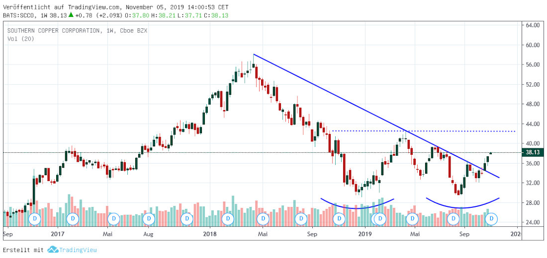 Die Aktie von Southern Copper Corp. hat diese Entwicklung bereits in Ansätzen nachvollzogen und dabei ihren mittelfristigen Abwärtstrend nach oben verlassen. Zuvor hat der Wert einen Doppelboden gebildet. Sollte nun auch noch die Nackenlinie des Doppelbodens bei 42,42 Dollar überwinden, ist mittelfristig ein Angriff auf das Hoch des Jahres 2018 bei 58,09 Dollar realistisch. Southern Copper ist in unserem Musterdepot Basis- und Edelmetalle enthalten.