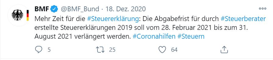 BMF twittert verlängerte Steuererklärungsfrist 2019 für Steuerberater