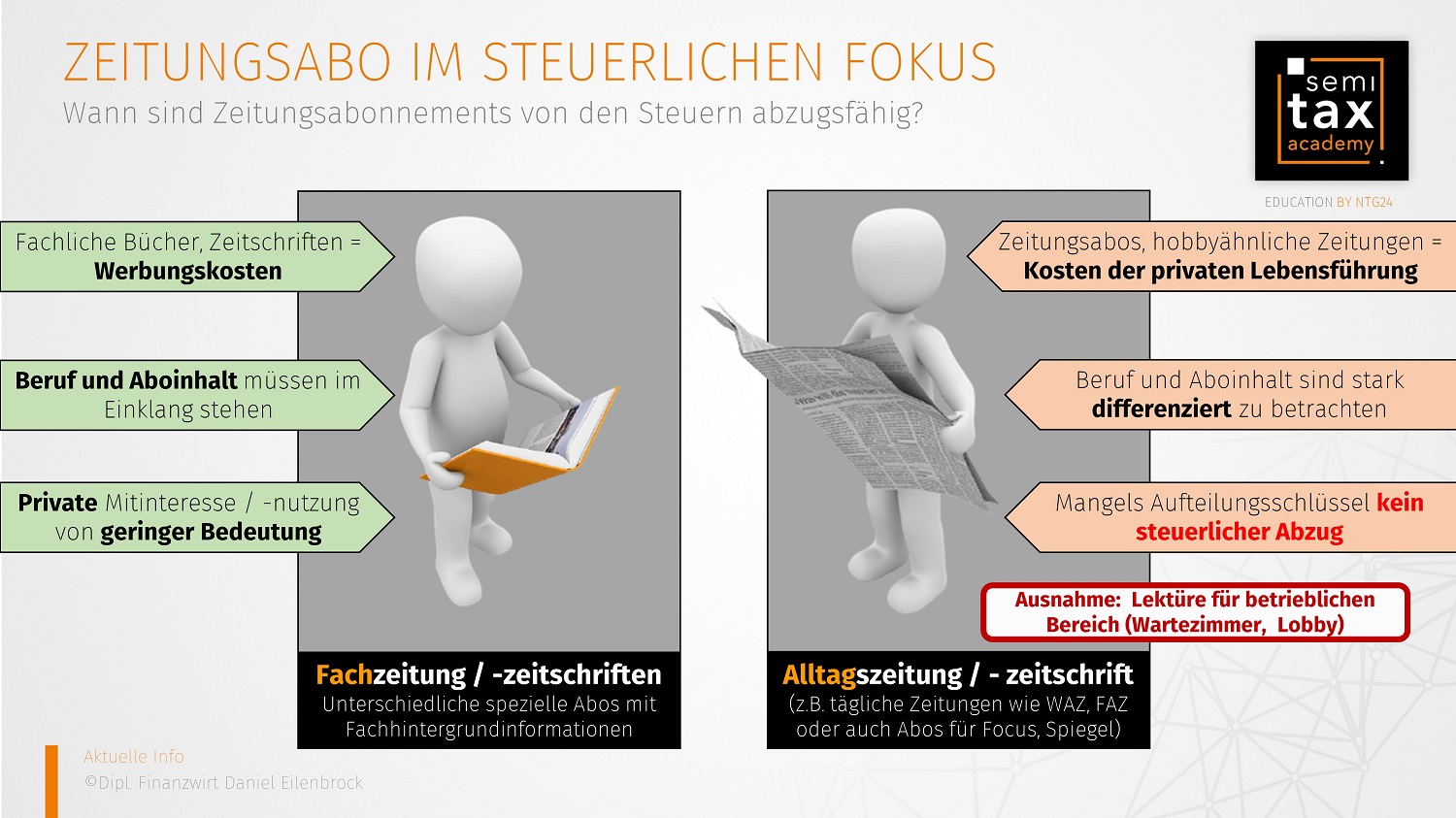 Die Welt wird zwar digitaler und in Zeiten von Google und Co. kann vieles kostenlos gelesen werden, aber bestimmte Inhalte bedürfen weiterhin ein kostenpflichtiges Abonnement. Hier stellt sich oft die Frage, wie die Kosten hierfür steuerlich abgesetzt werden können?