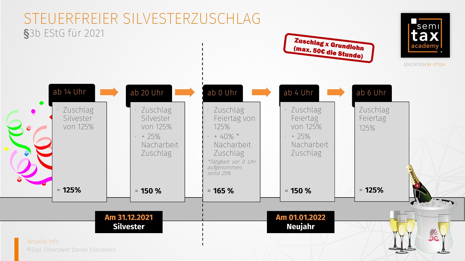 Der Gesetzgeber hat im §3b des Einkommensteuergesetzes Zuschläge für Sonntags-, Feiertags- oder Nachtarbeit verankert. Neben den klassischen Zuschlägen sieht er die Arbeit an Heiligabend und an Silvester als begünstigt an, obwohl dies keine Feiertage sind.