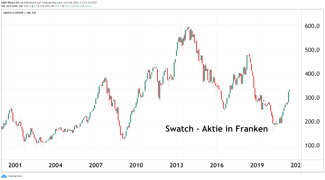 Bei der Swatch Group (CH0012255151) ist die Nettogewinnentwicklung bereits seit dem Geschäftsjahr 2013 deutlich negativ. Zudem litt der Konzern durch neue digitale Uhren unter einem zusätzlichen Wettbewerbsdruck, weshalb viele Aktionäre den Glauben an eine langfristige positive Entwicklung des Konzerns verloren. Entsprechend ist es keinesfalls verwunderlich, dass sich die Swatch-Aktie seitdem in einem langfristigen Abwärtstrend befindet, wobei das Papier ausgehend von einem Kursniveau von etwas mehr als 600 Franken zeitweise im Frühjahr 2020 unter die Marke von 200 Franken fiel. Allerdings zeichnet sich seit einigen Monaten nun eine massive Belebung des Geschäfts ab, was auch der Aktie wieder einen spürbaren Auftrieb gab.
