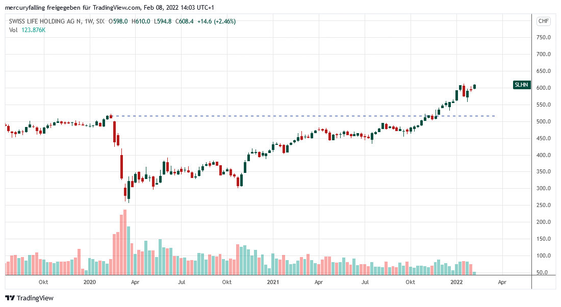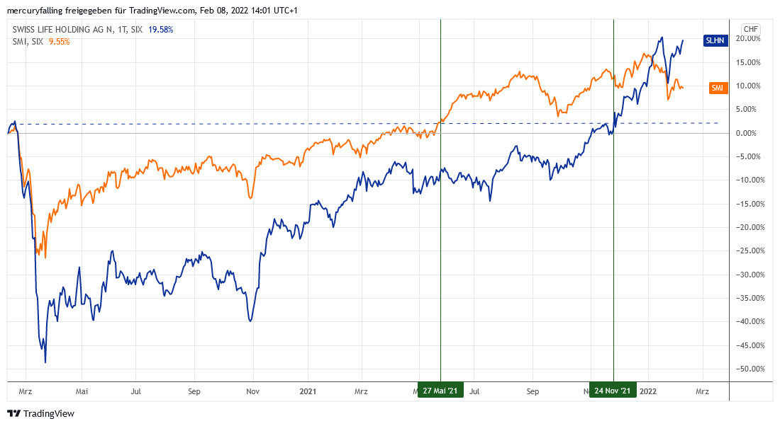 Die Aktie der Swiss Life Holding war im Corona-Crash ab Februar 2020 deutlich stärker abgestürzt als ihr Index, der SMI, wie Chart 1 zeigt. Danach brauchte der Titel auch länger, bis er das damalige Kursniveau wieder erreichte. Der SMI brauchte bis Mai 2021, während Swiss Life erst im November 2021 das Niveau vom Februar 2020 wieder erreichte.
