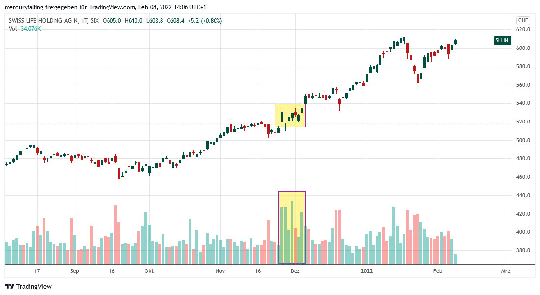 Chart 2 zeigt die absolute Entwicklung. Der Ausbruch über das Hoch vom Februar 2020 fällt dabei auch fundamental mit der Berichterstattung von Swiss Life auf dem Investorentag am 25.11.2021 zusammen.
