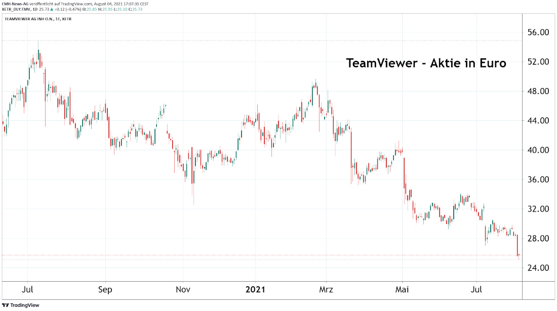 Während viele Technologie-Aktien seit vergangenem Sommer im Rahmen der allgemeinen Aktienhausse massive Kursgewinne verzeichnen konnten, befindet sich der Anteilschein des Softwareunternehmens TeamViewer (DE000A2YN900) seit Anfang Juli 2020 in einem deutlichen Abwärtstrend. Markierte die TeamViewer-Aktie damals noch bei 54,86 Euro ein Allzeithoch, so mussten die Investoren innerhalb von zwölf Monaten einen Kursverlust von ziemlich exakt 50 % in der Spitze hinnehmen. Entsprechend wurden die gestern kommunizierten Q2-Zahlen am Markt mit großer Spannung erwartet.
