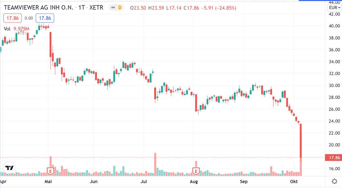Die Aktien des im MDAX gelisteten Software-Unternehmen TeamViewer (DE000A2YN900) kennen seit Beginn des Jahres nur eine Richtung und zwar nach unten. Die Papiere haben seit Januar 2021 über 50 % ihres Wertes verloren. Die erneute Reduzierung der Jahresprognose setzte den Kurs heute zusätzlich stark unter Druck. Die Aktien gingen schlussendlich bei 18,16 € mit einem Verlust von 23,32 % aus dem Handel an der Deutschen Börse. Damit notieren sie auf einem Rekordtief.