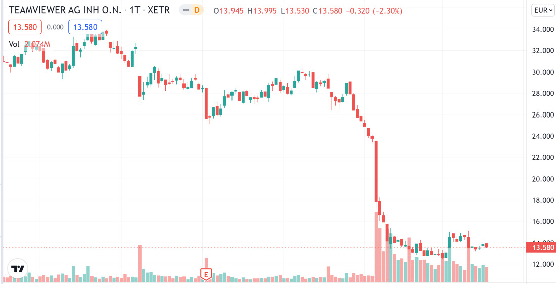 Die Meldung setzte die Aktie von TeamViewer im heutigen Handel weiter unter Druck. Am Abend ging der Titel mit einem Verlust von 3,1 % bei 13,58 € aus dem Handel. Vom Allzeithoch bei 52,80 € ist die Aktie mittlerweile weit entfernt. Die Korrektur begann für TeamViewer nach den schwachen Quartalszahlen im ersten Quartal 2021 und setzte sich getrieben durch die unverhältnismäßigen Marketingkosten weiter fort.