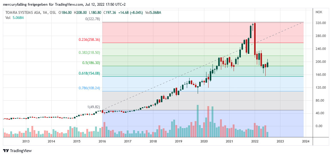 Nachdem die Aktie von Tomra am 04.01.2022 bei 322,20 NOK das aktuelle Allzeithoch markiert hatte, fiel der Aktienkurs in der anschließenden Korrektur bis auf 155,06 NOK am 22.06.2022. Auf diesem Niveau liegt auch das 61,6 % - Fibonacci-Retracrement, ausgehend vom Zwischenhoch im Januar 2016.