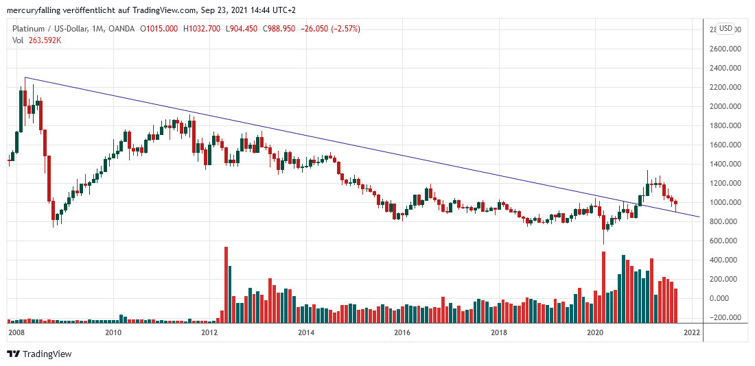 Der jüngste Kurseinbruch von Platin führte, wie in nachfolgendem Chart zu sehen, bis zu seiner 2020 überwundenen langfristigen Abwärtstrend-Linie. Sollte nun auf Monatsschlusskurs-Basis auch das statische Unterstützungsniveau halten, ist es sehr wahrscheinlich, dass es sich bei der Abwärtsbewegung seit Mitte Mai 2021 um eine Korrektur in einem neuen langfristigen Aufwärtstrend handelt.