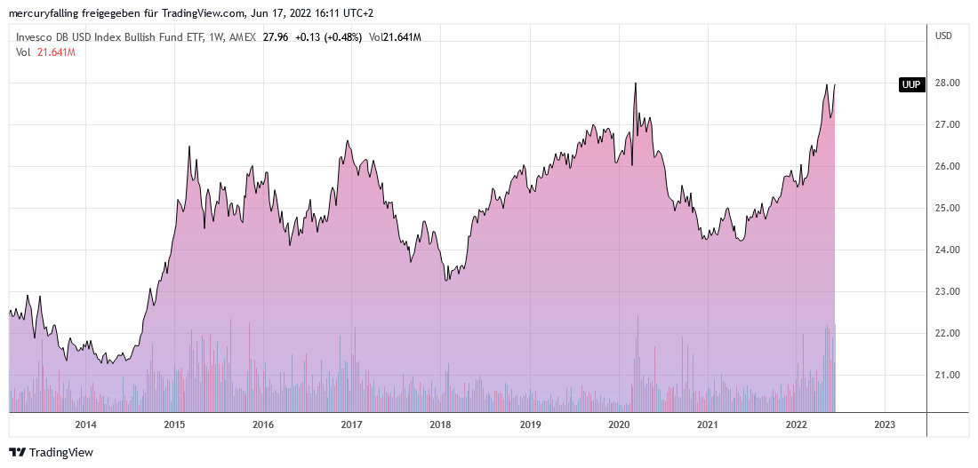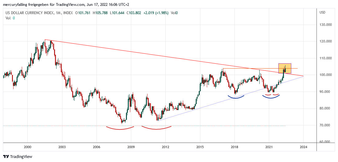 Hinzu kommt, dass der US-Dollar-Index, der die Entwicklung des US-Dollars gegen 6 Korbwährungen (s.u.) abbildet, seit dem Einmarsch Russlands in die Ukraine auch auf langfristiger Skale signifikant aus seinem seit Juli 2001 laufenden Abwärtstrend nach oben ausgebrochen ist. Zuvor hatte er einen ausgedehnten Konsolidierungsboden gebildet und diesen ab 2014 in Form eines erneuten kleineren Doppelbodens konsolidiert. Aus diesen ist er nun nach oben ausgebrochen und hat das Zwischenhoch vom Januar 2017 bei 103,72 Punkten überwunden.