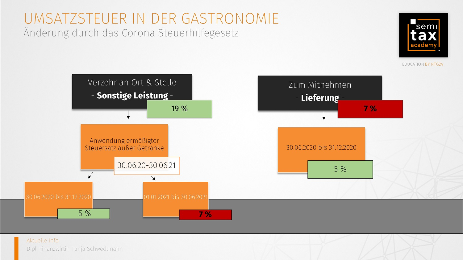 Durch das Zweite Corona-Steuerhilfegesetz unterliegen die Restaurationsleistungen befristet nur noch dem ermäßigten Steuersatz, dieser beträgt regulär 7 Prozent. Durch die Absenkung des Steuersatzes auf 5 Prozent vom 1. Juli 2020 bis 31. Dezember 2020 wird die Gastronomie zusätzlich begünstigt.