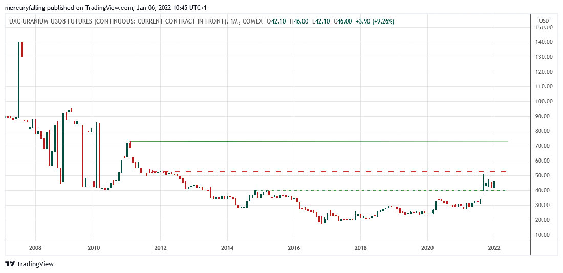 Mit den neuen Unruhen in Kasachstan steigen nun aber die Chancen dafür, dass der Uranpreis aus eben dieser Konsolidierungsphase nach oben ausbricht. Dabei macht ein Überwinden der Widerstandszone im Bereich von 52,50 Dollar einen Anstieg in Richtung 70 Dollar sehr wahrscheinlich, wie wir bereits in unserem Beitrag vom 11.11.2021 ,,Uran könnte eine Konsolidierung im Zeitraffer durchmachen‘‘ darlegten.