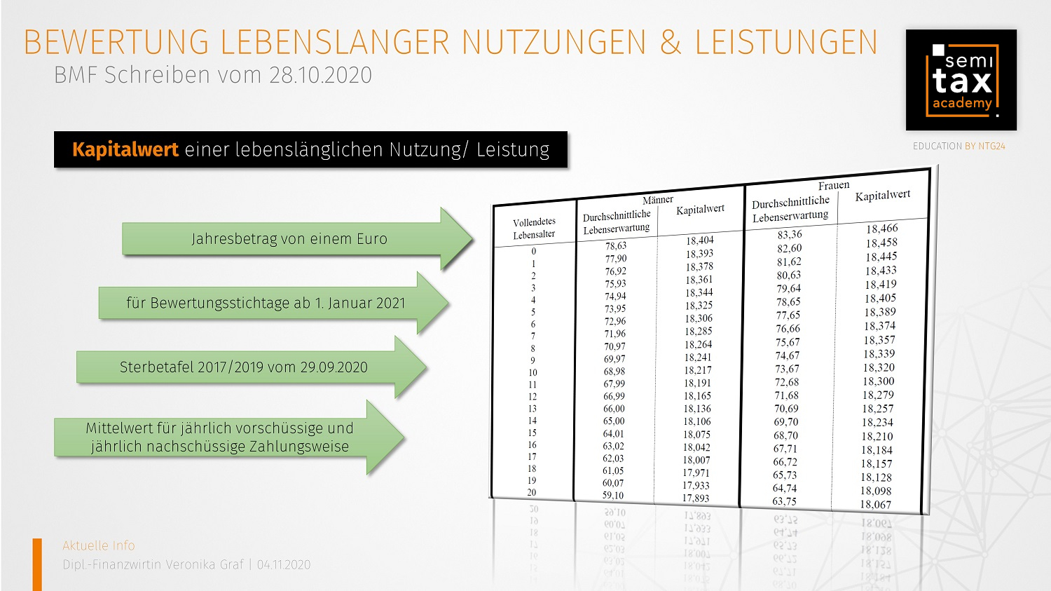 Mit BMF-Schreiben vom 28.10.2020 sind die Vervielfältiger für die Berechnung des Kapitalwerts lebenslanger Nutzungen und Leistungen veröffentlich worden. Diese sind entsprechend der am 29.09.2020 veröffentlichten Sterbetafel 2017/2019 des Statistischen Bundesamtes ermittelt worden und gelten für Bewertungsstichtage ab dem 01.01.2021.
