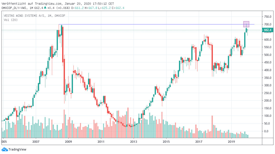 Die Aktie von Vestas Wind hat im Dezember 2019 bereits kurzfristig ein neues Allzeithoch erreicht. Wir sind für die weitere Entwicklung zuversichtlich, weshalb ein Ausbruch über die blau dargestellt Widerstandslinie nur eine Frage der Zeit sein sollte.