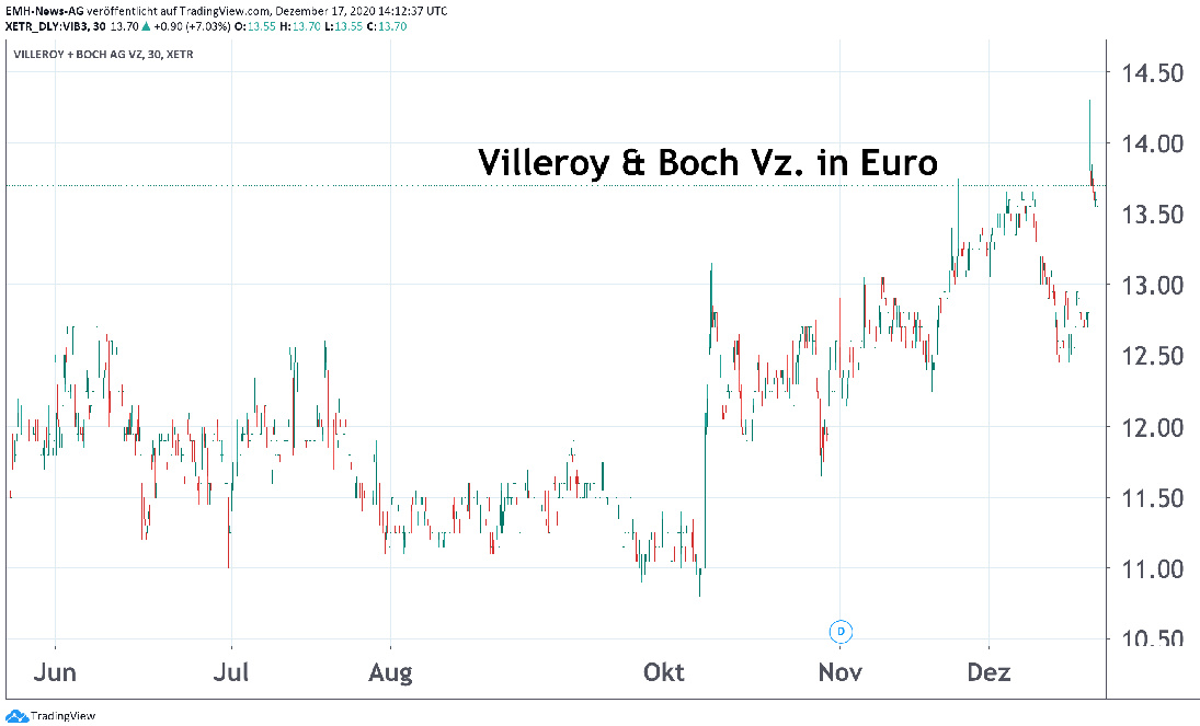 Aktuell leiden viele Unternehmen unter der Covid-19-Pandemie. Bei der Firma Villeroy & Boch dürfte aber das Gegenteil der Fall sein. Denn mit den neuerlichen Ausgangsbeschränkungen dürften viele Kunden dazu tendieren, mehr Geld für die hochwertigen Produkte des Geschäftsbereichs Tischkultur zu investieren. Zudem wird bereits ein wesentlicher Teil der Produkte über Online-Kanäle vertrieben, weshalb Villeroy & Boch nicht ganz so stark vom aktuellen Lockdown betroffen sein könnte.