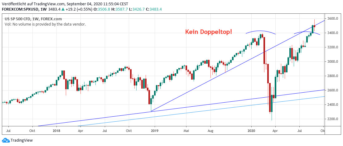 Ein Blick auf die mittelfristige Entwicklung des S&P 500 zeigt, dass dieser sein Allzeithoch vor dem Corona-Schock im März 2020 Ende August überschritten hat. Damit ist die Vermutung widerlegt, dass sich der Markt in Form eines Doppeltops konsolidiert.