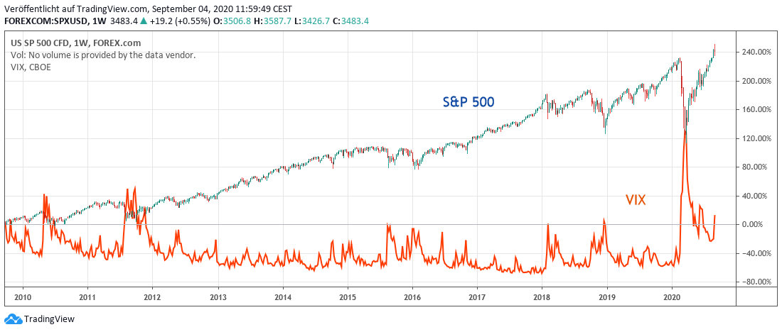 Als Fazit kamen wir in unserer Analyse des VIX am 11.08.2020 zu folgendem Schluss: ,,Aus saisonaler Perspektive ist deshalb trotz des überwundenen Schlusskurses auf Monatsbasis im S&P 500 – Index weiter und steigende Vorsicht geboten. Dies ist die Botschaft des VIX. Wer sich gegen fallende Kurse absichern will, findet auf dem aktuellen Niveau preiswerte Alternativen. Ein Rückgang des VIX bis in den Bereich von 15 Punkten wäre zwar möglich, aber angesichts der weiter hohen Unsicherheit eine kleine Überraschung.
