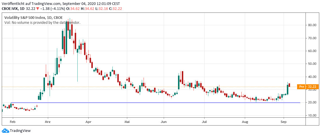 Im Zuge des Ausverkaufs von gestern sprang der VIX nun um 7,03 Punkte bzw. 26,46 % auf einen Schlusskurs von 33,60 Punkten, nachdem er im Handelsverlauf bereits ein Tageshöchst von 35, 94 erreicht hatte.