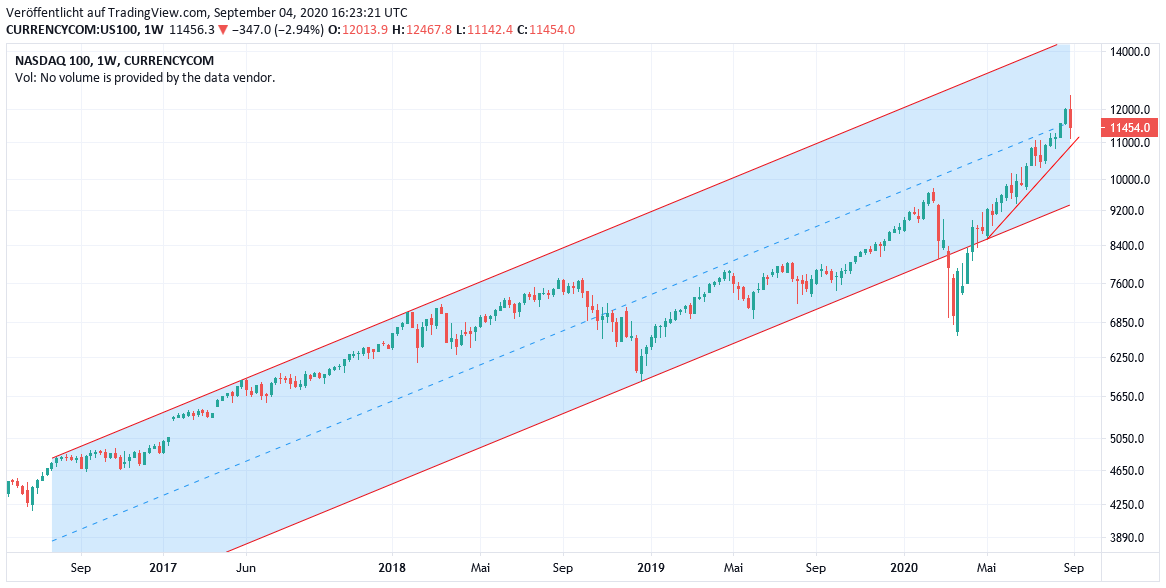 Nein, eine solche Einschätzung verkennt vielmehr, dass in Wirklichkeit der NASDAQ 100-Index spätestens ab der nur noch panikgesteuerten 2. Hälfte des Corona-Crashs von Anfang – Mitte März jeglichen in den letzten Jahren üblichen Boden seines normalen Trendwachstums massiv nach unten durchschlagen hat und in eine bis dahin historisch noch kaum dagewesene Unterbewertung übergegangen ist.