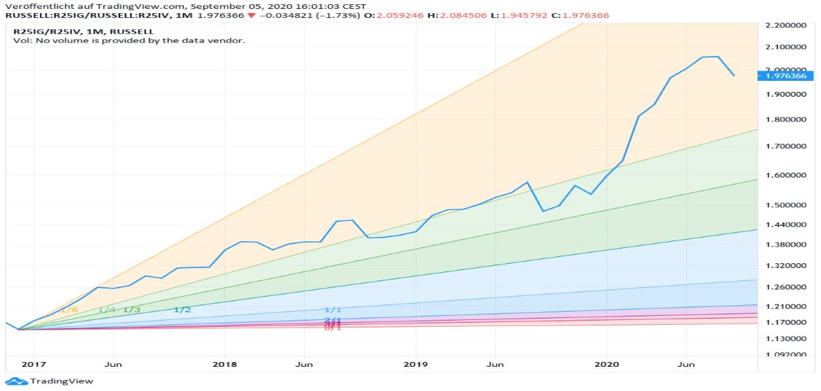 Der Gann-Fächer stellt dabei eine geläufige optische Methodik dafür dar, mit diesem Hilfsmittel auf einen Blick zu erkennen, wie weit historische Verhältnisse zweier Variablen zueinander (hier also die Russell 2500- Growth- und Value-Indizes) in Fortschreibung ihrer Historie zum aktuellen Zeitpunkt entweder aus dem Ruder gelaufen sind, oder sich noch in geordneten historischen Bahnen bewegen.