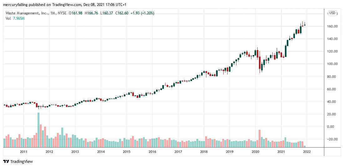 Die Aktie von Waste Management (US94106L1098) gehörte im letzten Jahrzehnt zu den trendstabilsten Aktien in den USA. Denn gerade die ,,Service Economy‘‘ in den USA macht trotz aller ,,grünen Transformationen‘‘ immer noch eine Menge Müll, und auf diesen hat es das Unternehmen abgesehen.