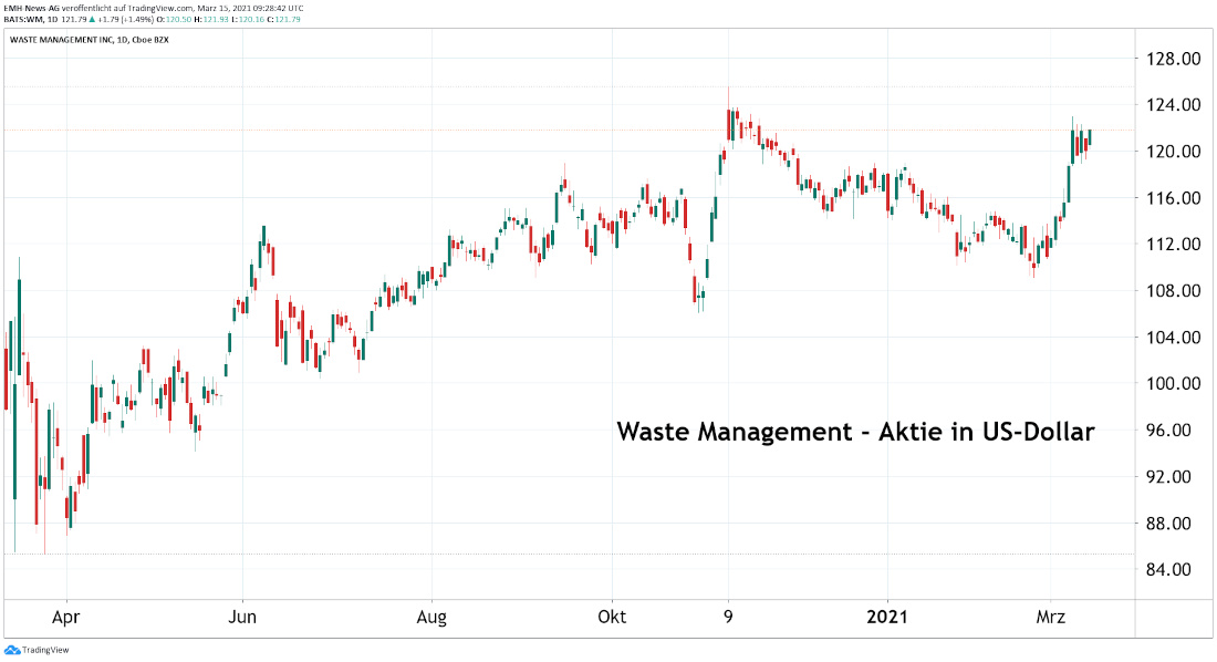 Zwar entwickelten sich die Erlöse und der Reingewinn bei Waste Management im Corona-Rezessionsjahr 2020 leicht rückläufig, dennoch bleiben die Wachstumsaussichten für die Amerikaner voll intakt. Besonders aussichtsreich ist hierbei das Recycling-Geschäft, das im Jahr 2020 das Zugpferd im Konzern war und seinen Umsatz um 8.4 % ausbauen konnte. Da die Firma massiv in diese Sparte investiert und die Preise für viele Grundstoffe derzeit steigen, sollte der Umsatz, der zuletzt 7.4 % der Gesamterlöse ausmachte, künftig noch weitaus deutlicher ausgebaut werden.