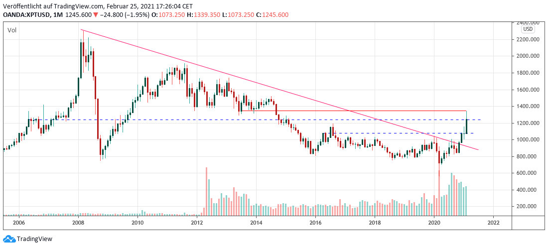 Der Anstieg des Platinpreises in den letzten Wochen hat diesen bis an bedeutende Widerstände geführt, an die er zunächst abgeprallt ist. Einer dieser noch nicht überwundenen Widerstandszonen stammt aus dem Jahr 2013 und ist in unten abgebildeten Chart als rote Horizontale abgebildet. Der Platinpreis hat diese kurz gestreift und fiel danach erst einmal zurück.