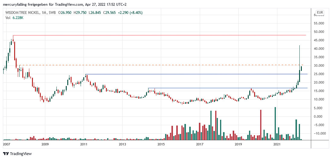 Ein längerfristiger Blick auf die Entwicklung des Wisdom Tree Nickel ETF zeigt zudem, dass sich der Nickelpreis seit dem Short-Squeeze und der Handelsaussetzung an der LME wieder deutlich zurückgebildet hat.