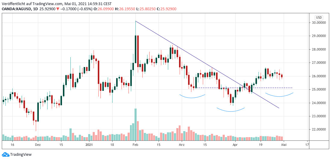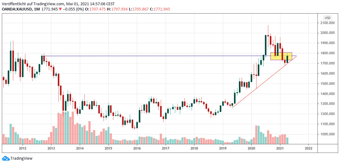 Ein Blick auf den Monatschart von Gold zeigt, dass der Candle für April auf dem Widerstandsniveau vom September und Oktober 2012, welches dem Unterstützungsniveau vom November und Dezember 2020 entspricht, zum Stehen gekommen ist. Damit ist der Goldpreis kurzfristig eingeklemmt und hat nach unten seine nächste Stütze durch die dynamische Unterstützung, die sein mittelfristiger Aufwärtstrend bildet. Ein Überwinden der Widerstandszone auf Monatsbasis ist derzeit wahrscheinlicher, ein nochmaliger Rückgang oder eine Seitwärtsbewegung jedoch ebenso möglich.