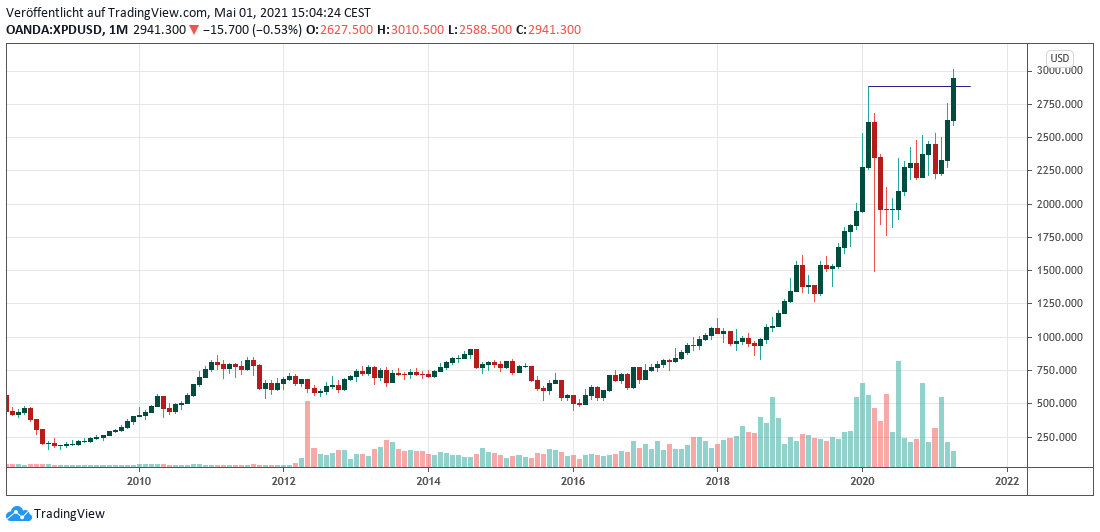 Palladium schaffte es in dieser Woche erstmals, die Marke von 3.000 Dollar zu überwinden. Das neue Allzeithoch wurde gestern mit 3.010,50 Dollar erreicht.