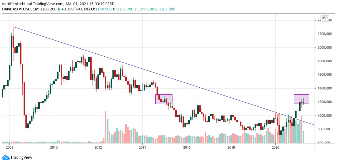 Platin gab per saldo in dieser Woche 2,3 % auf 1.202 Dollar ab. Charttechnisch ist Platin damit an seinem Widerstand auf Monatsbasis, wie im Chart zu sehen, abgeprallt. Die seit dem Jahreshoch Mitte Februar 2021 laufende Konsolidierung setzt sich damit weiter fort.