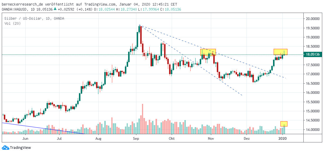 In den Handelstagen nach dem 20.12.2019 zeigten die Edelmetalle eine starke Aufwärtsbewegung. Dies dürfte zum einen an der nach wie vor hohen Liquiditätsschöpfung durch die US-Notenbank liegen. Vor allem aber brachte die erneute Eskalation der geopolitischen Spannungen im Nahen Osten und auf der koreanischen Halbinsel den Anlegern in Erinnerung, dass sogenannte ,,Safe Haven Assets‘‘, also Anlagen, die bei Turbulenzen, Unsicherheit oder bei Krisen, eine hohe relative Wertstabilität aufweisen, durchaus eine nicht zu unterschätzende Bedeutung besitzen. Hierzu gehört insbesondere Gold. Rückenwind erhielten die Edelmetalle phasenweise auch durch einen zunächst schwächeren US-Dollar, der von 1,1076 am 20.12.2019 auf 1,1156 Dollar 0,8 % per gestrigem Schlusskurs gegen den Euro abwertete. Gleichzeitig stieg Gold vom Schlusskurs am 20.12.2019 bei 1477,97 Dollar auf 1552,11 Dollar am 03.01.2020 und damit um glatte 5 %. Wie der Chart zeigt, überwand Gold per 23.12.2019 seinen mittelfristigen Abwärtstrend und in der Folge auch noch mehrere kleine statische Widerstände. Nun steht das gelbe Metall mit guten Umsätzen (siehe gelbes Quadrat) kurz vor seinem Zyklushoch vom 04.09.2019 bei 1557,10 Dollar. Ein Überwinden würde ein bedeutendes mittelfristiges Kaufsignal auslösen und den vorangegangenen Ausbruch aus seiner jahrelangen Bodenbildung bestätigen. Die letzten CoT-Daten vom 24.12.2019 zeigten im Übrigen eine Ausweitung der Short-Position der Commercials. Diese stieg um 7 % auf 340.396 Kontrakte. Es sei allerdings darauf hingewiesen, dass bei sich beschleunigenden Aufwärtstrends das Short-Niveau durchaus noch stärker steigen kann. In der Gesamtbewertung hat sich die Lage für Gold stark verbessert, ein spätestens mittelfristiger weiterer Anstieg ist deutlich wahrscheinlicher geworden.