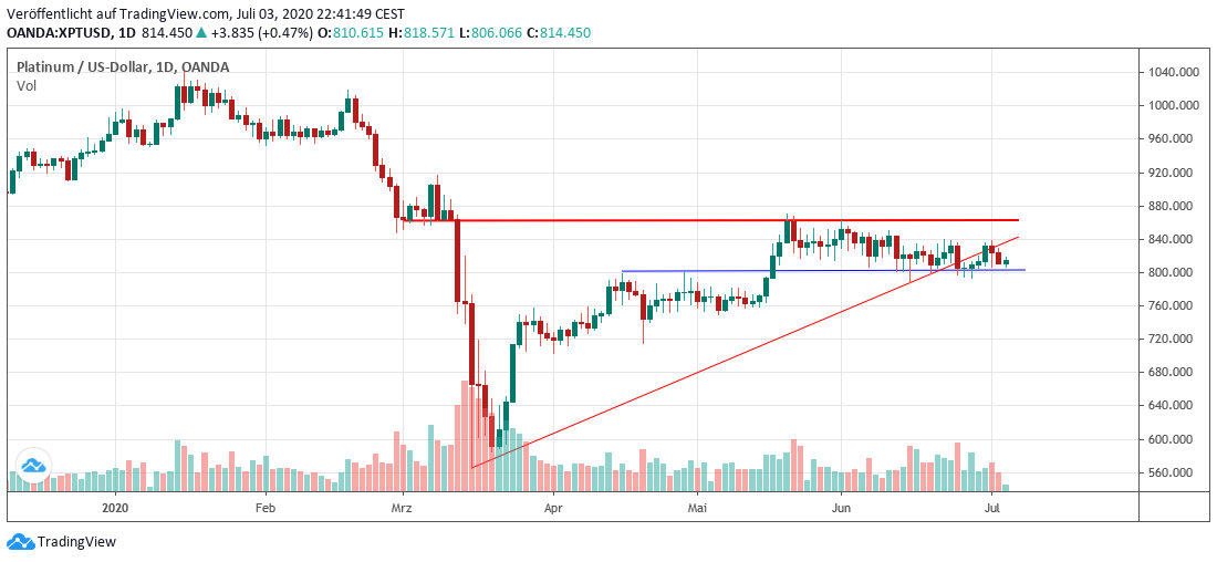 Dabei hielt auch beim Platinpreis die Unterstützung, liegt aber anders als bei Silber nahe des Wochenschlusskurses. Im Wochenvergleich gewann Platin 7,63 Dollar bzw. 0,9 %.