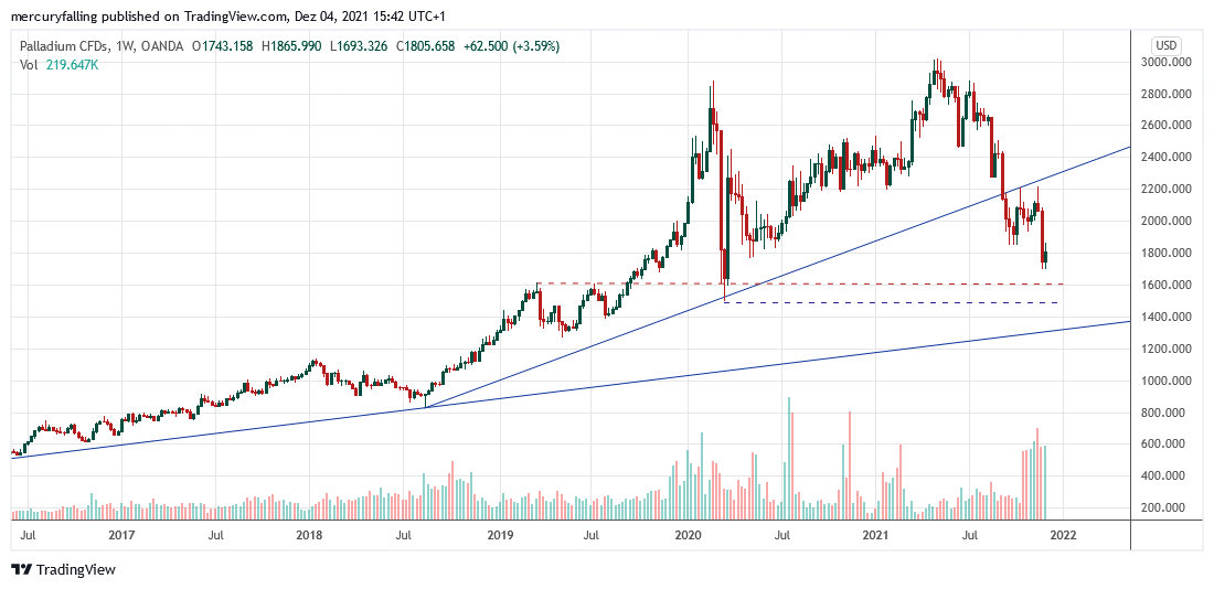 Palladium konnte sich in dieser Woche vom anhaltenden Abwärtstrend seiner Geschwister lösen, was vor dem Hintergrund der hohen vorangegangenen Verluste und der hohen Überverkauftheit auch keine wirkliche Überraschung war.