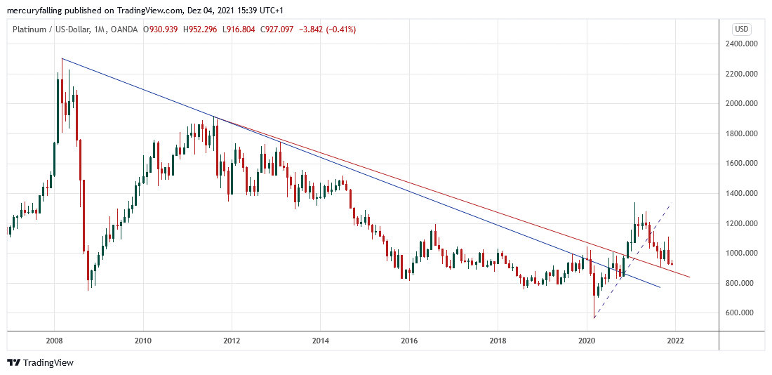Insgesamt weist Platin aktuell keine deutlich symmetrischen Formen auf, welche eine Bodenbildung vermuten lassen. Potenziell wäre eine Doppelbodenbildung oberhalb von 914,45 Dollar aktuell das am nahesten liegende Szenario.