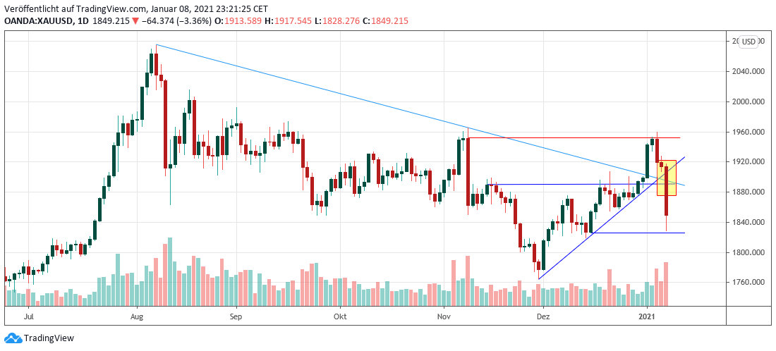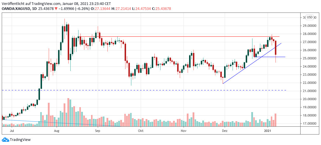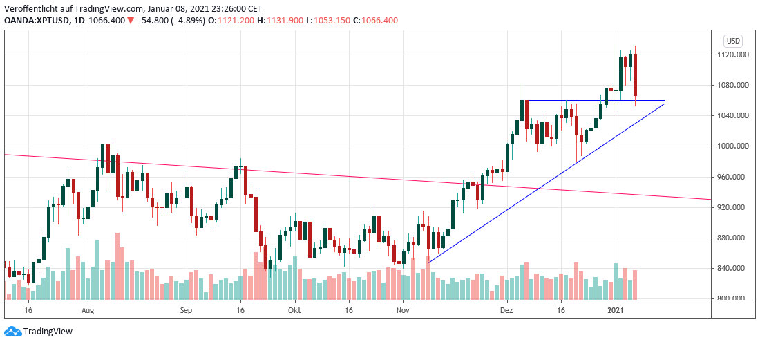 Bei Platin wurde dabei auch der mittelfristige Aufwärtstrend nicht unterschritten, was auch an der vorangegangenen Aufwärtsbewegung am 05.01.2021 lag.