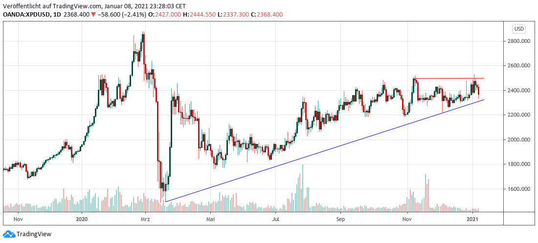 Mit dem Rückgang am Freitag hat der Palladiumpreis auf die vorherige Diamantenkante aufgesetzt, diese aber per Schlusskurs nicht unterschritten.
