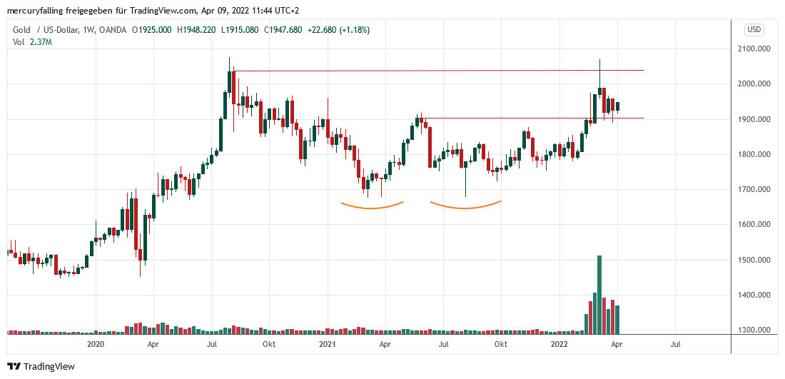 Damit ist die Korrektur nach dem Jahreshoch am 08.03.2022 bei 2.070,63 Dollar zwar noch nicht beendet, aber die Chancen dafür haben sich in dieser Woche verbessert. Ein deutliches Indiz dafür wäre zudem ein Überwinden der Nackenlinie der Bodenformation, welches am 24.03.2022 bei 1.966,21 Dollar gebildet wurde.